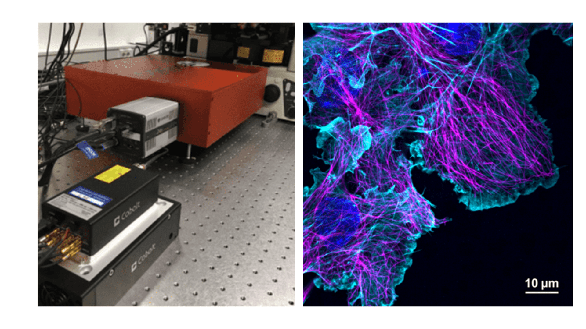 Fig 1. The Cobolt Skyra in use in the department of biotechnology and biophysics at Julius Maximilian-University of Wurzburg. Imaging of African green monkey kidney cell (COS7) with nucleus (blue), microtubules (red/magenta) and the actin sceleton (green/cyan) staining.