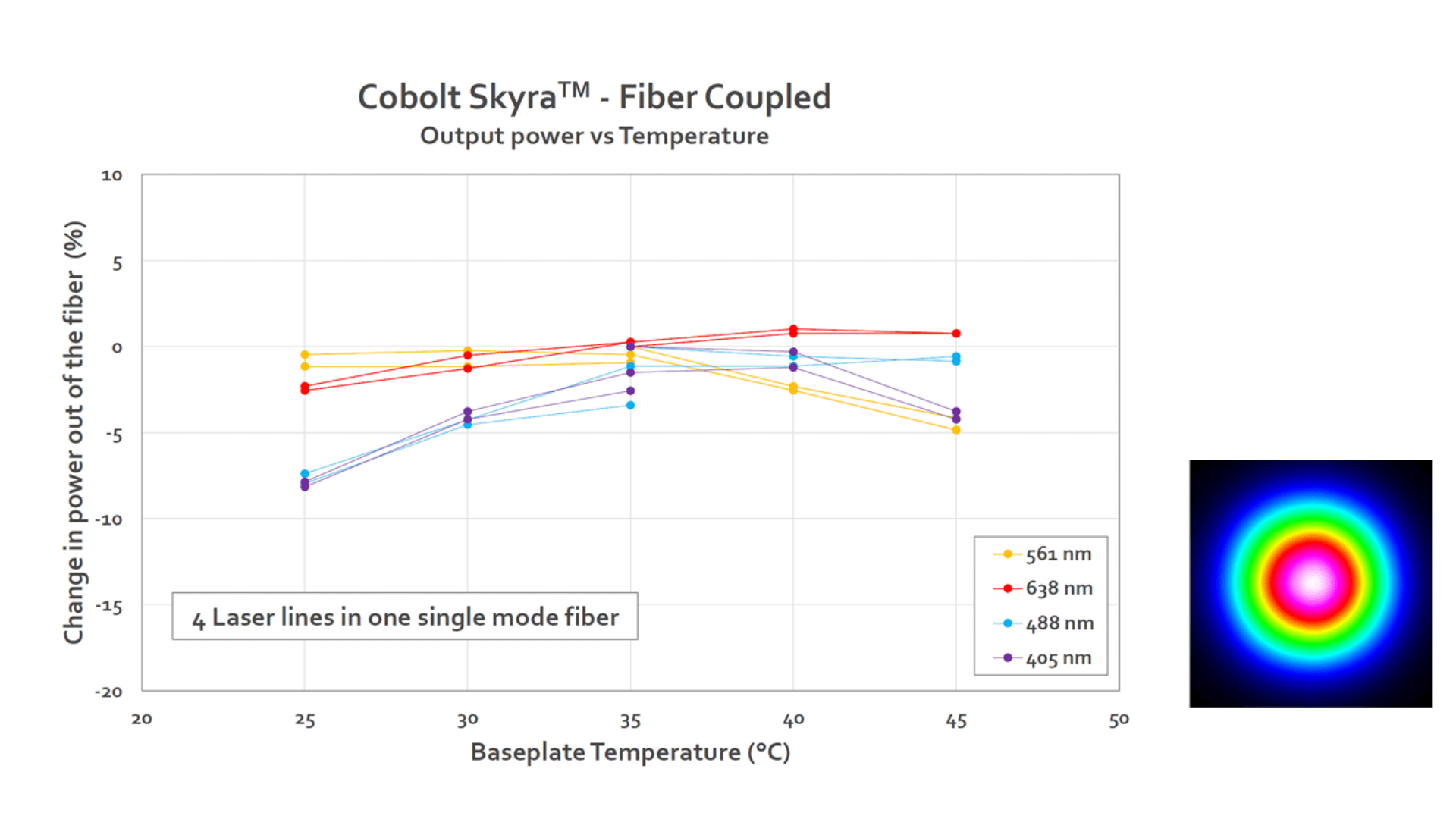 Fig 2. Power stability of the Cobolt Skyra with four lines coupled through SM/PM fiber in temperature cycling of the baseplate. Fig 3 Beam profile of four lines free space overlapped.