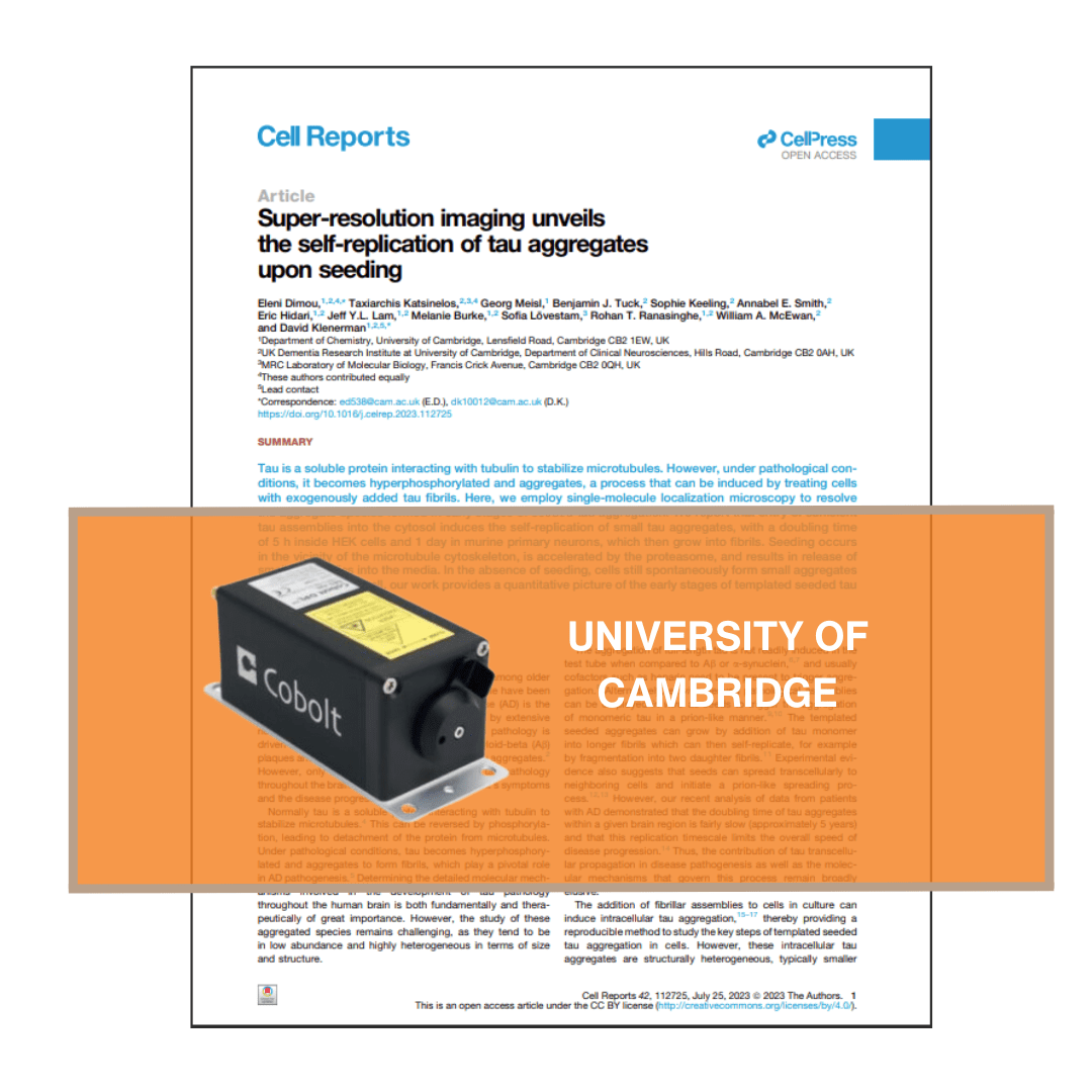 Researchers from the University of Cambridge have made significant strides in understanding Alzheimer’s disease by using super-resolution microscopy to observe tau protein aggregates within cells with the help of the Cobolt 06-MLD. The group used the following wavelengths: 405, 488, 561 and 638 nm.