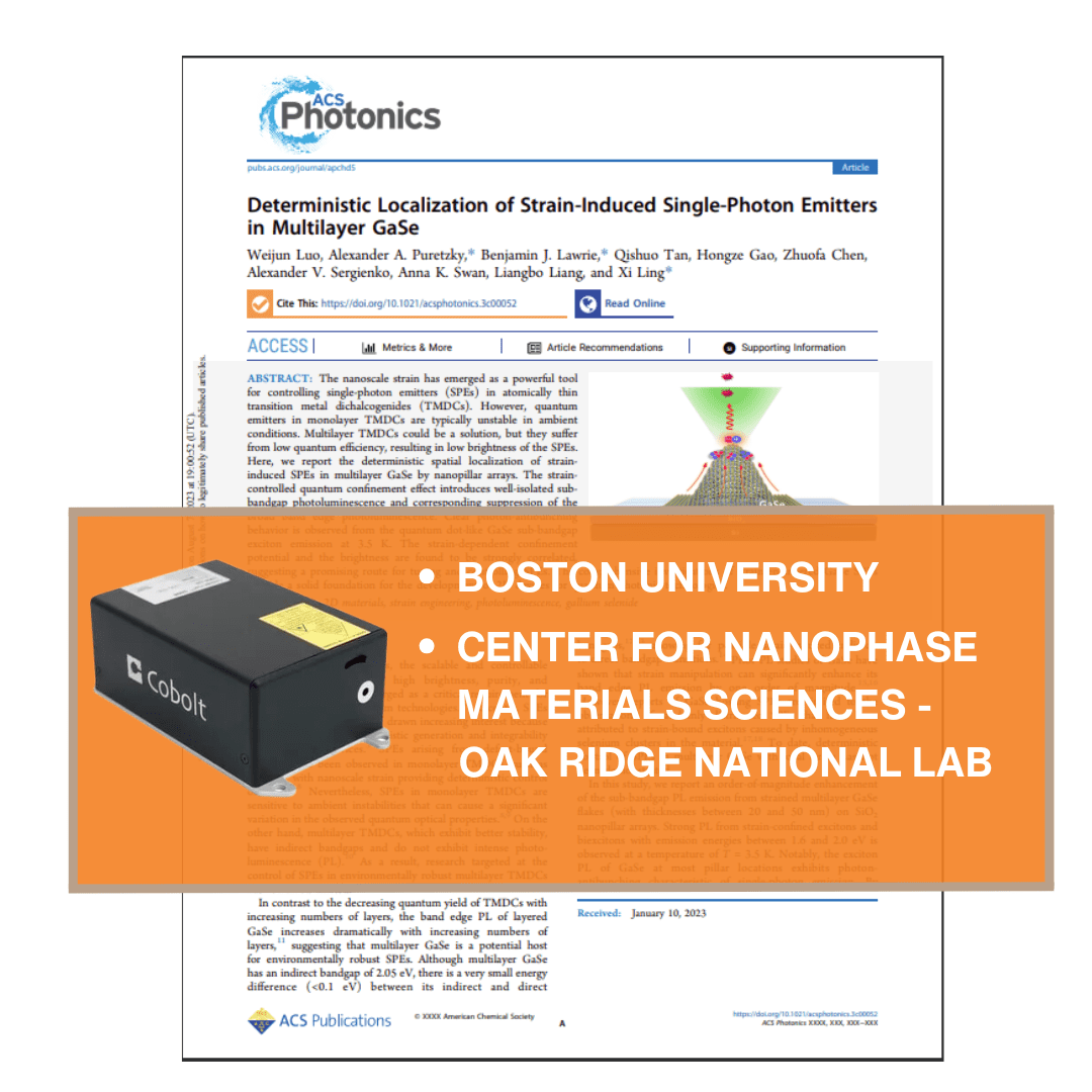 Researchers from Boston University and the Center for Nanophase Materials Science at the Oak Ridge Nationla Laboratory have made a significant advancement in the field of quantum photonics by using strain to control single-photon emitters (SPEs) in multilayer gallium selenide (GaSe). In the experiment the group used the 532 nm Cobolt laser as excitation source.